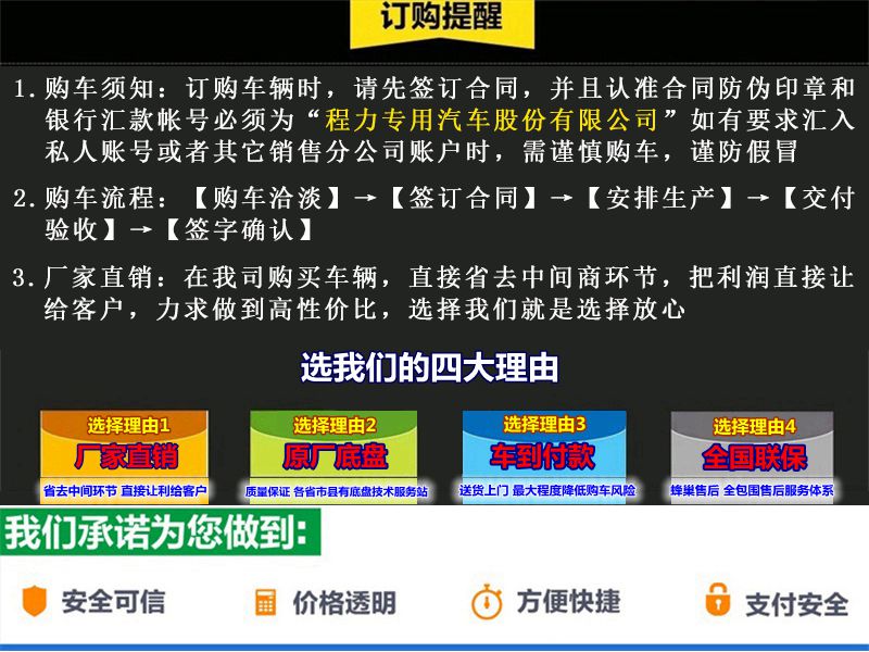 我们将谒诚为您提供好、快、优质的服务! ·**步:购车洽谈: 通过电话联系或实地考察洽谈车辆型号、价格和相关要求。 ·**步:签订合同: 双方签订车辆购销合同并预付合同定金(传真签订合同、实地签订合同均可)。 ·第三步:安排生产: 我公司根据合同要求,安排车间生产。 ·第四步:交付车辆: 车辆交付验收,支付车辆余款,完成相关手续。 交付方式:客户可自提车辆,也可协商由我公司安排送车并协定相关费用.更多详细订车流程请来电咨询! |